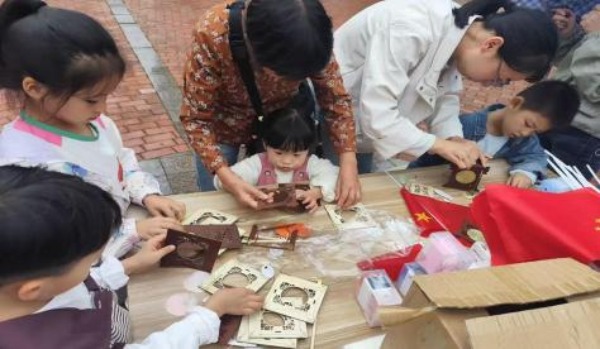活動(dòng)中,家長和孩子分工協(xié)作,有人勾勒國旗紋路,有 人調(diào)配“ 中國紅” ,有人繪制“我愛中國”“五角星”等國 慶元素,圖案躍然娃娃身上。孩子們舉著作品歡呼,家長用 鏡頭定格溫馨,現(xiàn)場(chǎng)歡聲笑語不斷,童趣與愛國情懷在色彩 中交融綻放。