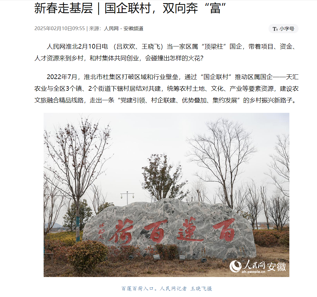 在杜集區(qū)的鄉(xiāng)村振興實(shí)踐中,在集團(tuán)公司的戰(zhàn)略引領(lǐng)與資源支持下,與鄉(xiāng)村緊密攜手,天匯農(nóng)業(yè)與全區(qū)3個鎮(zhèn)、2個街道下轄村居結(jié)對共建,統(tǒng)籌農(nóng)村土地、文化、產(chǎn)業(yè)等要素資源,建設(shè)農(nóng)文旅融合精品線路,走出了一條獨(dú)具特色的發(fā)展之路, 近日,人民網(wǎng)在新春走基層系列報道中,聚焦淮北市杜集區(qū)的“國企聯(lián)村”模式,對淮北市天匯農(nóng)業(yè)發(fā)展有限公司進(jìn)行了重點(diǎn)報道。