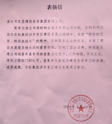 26 04月2024 了解詳情 通皓物業(yè)喜獲杜集區(qū)經(jīng)濟開發(fā)區(qū)委員會表揚信一封 近日,通皓物業(yè)收到一封來自業(yè)主單位杜集區(qū)經(jīng)濟開發(fā)區(qū)委員會的表揚信,信中業(yè)主單位對我公司良好的工作作風(fēng)、熱枕的服務(wù)意識表示高度贊揚。